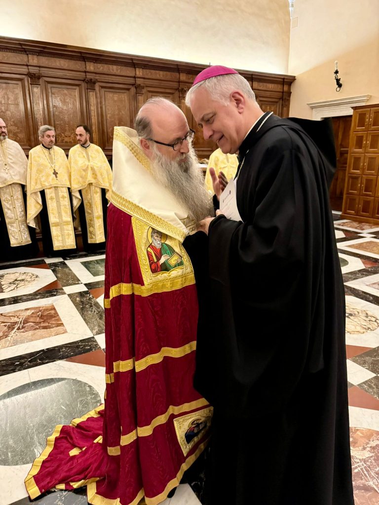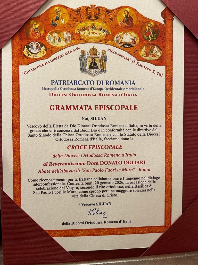 Al termine della celebrazione, Sua Ecc.za Rev.ma Siluan ha conferito all’Abate Donato la Croce Episcopale della Diocesi Ortodossa Romena d’Italia. L’encomio è stato assegnato “come riconoscimento per la fraterna collaborazione e l’impegno nel dialogo interconfessionale” e “come sprone per una maggiore solerzia nella vita della Chiesa di Cristo”.